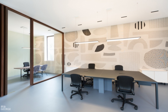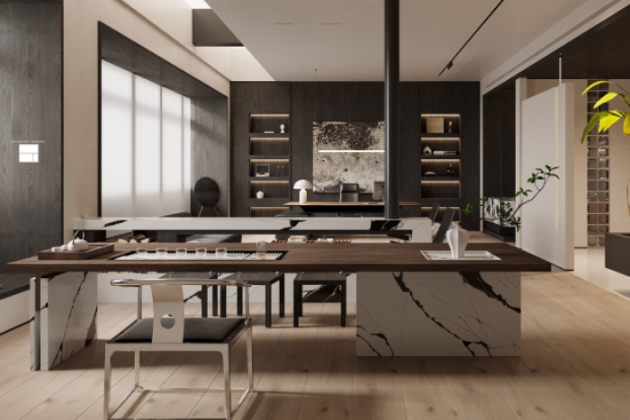在辦公室設(shè)計(jì)理念上應(yīng)當(dāng)突顯舒適、順暢、開闊等優(yōu)點(diǎn)。采用延展的手繪進(jìn)行裝飾,以及光照明朗的吊頂上下呼應(yīng),可加強(qiáng)其“靈透”感。
